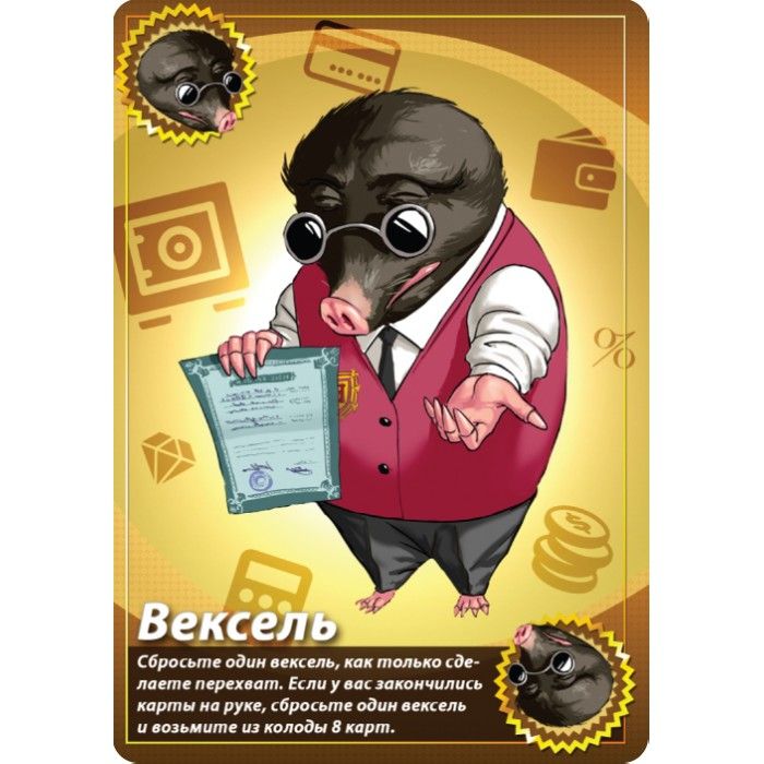 + Карты векселей (кроты-банкиры) - принципиально новый тип карт, который вы не найдете ни в одном из наборов серии Свинтус, кроме как в Делюкс издании. Эти карты используются только вместе со специальным игровым полем. На этом поле игроки будут отмечать свои победы в серии игровых партий, передвигая фишки по треку побед. Как только фишка проходит клетку с кротовьей норой - получите и распишитесь - крот банкир вручает вам вексель, который надо погасить. Погасить, то есть сбросить карту с руки, можно только двумя способами - совершив перехват, или избавившись от всех карт с руки. Но не спешите радоваться - избавившись от карт и сбрасывая вексель, победа вам не достается. Не возмущайтесь, просто вы, как и все новички в коммерции, не читаете мелкий шрифт документов - после сброса векселя вы получаете восемь новых карт и продолжаете игру! И кто после этого слепой крот?