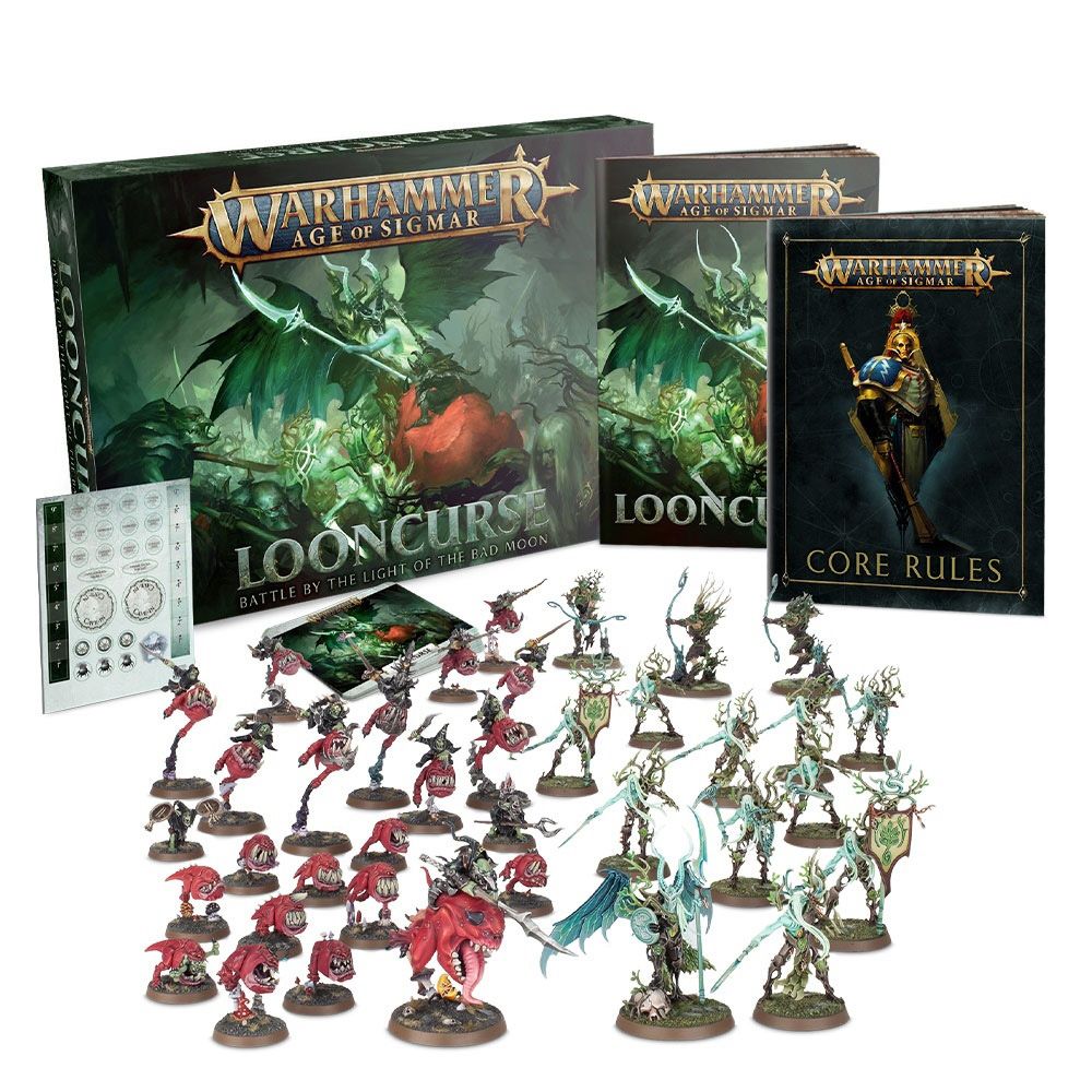 “Age of Sigmar: Looncurse” – стартовый набор для двух игроков, содержащий всё необходимое, чтобы вы смогли приобщиться к захватывающей настольной стратегической игре с миниатюрами “Age of Sigmar”. Здесь, среди Смертных Царств эпохи Сигмара, могучие Герои ведут войска в бой. Здесь многомудрые Волшебники творят чары такой немыслимой силы, что вырвись такая магия из-под контроля, и она способна превратить леса в пустыни, а древние горы – в невесомый прах. Полубоги ходят среди смертных, а народы формируют могучие Альянсы. В этом удивительном и жестоком мире игроки выступят в качестве генералов, одним мановением руки ведущим войска к славе или гибели.