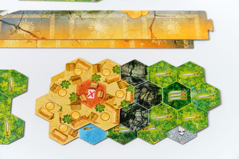 Розыгрыш карт с руки. Во-первых, это необходимо для перемещения мипла на свободный гекс игрового поля. Для этого разыграйте карту нужного цвета, которая имеет необходимое количество очков сложности местности. Чтобы преодолеть реку, нужна синяя карта, за счёт зелёных карт вы сможете пробраться сквозь джунгли, жёлтые карты помогут пройти поселения и нанять новых членов команды. Для преодоления препятствия нужно будет оплатить его стоимость, а тайл препятствия – забрать себе. Если вы желаете пройтись по каменистой поверхности, сбросьте обозначенное количество карт. Если ваш мипл остановился около чёрной пещеры, заберите верхний жетон и получите одноразовый бонус. Если вы попали на красный гекс лагеря, то разыгранная карта не сбрасывается, а вовсе удаляется из игры. Также одноразовым эффектом обладают и карты с красными крестиками, это такие себе джокеры. В случае, когда вам понадобилось прикупить карт с рынка, используйте жёлтые карты с символами монет и оплачивайте стоимость новых карт сначала из нижнего ряда, постепенно поднимаясь выше. Приобретённые карты отправляются в сброс. В ходе игры у вас может появиться фиолетовая карта, отвечающая за действия, разыграть которую можно в любое время.